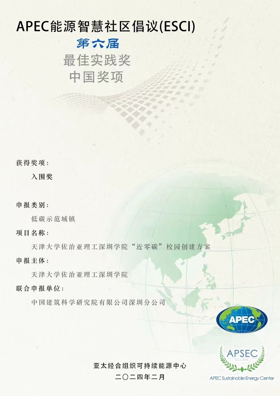 近日,由中國(guó)建研院深圳分公司承接的“近零碳”校園咨詢項(xiàng)目——天津大學(xué)佐治亞理工深圳學(xué)院成功獲得第六屆APEC能源智慧社區(qū)倡議(ESCI)最佳實(shí)踐獎(jiǎng)中國(guó)獎(jiǎng)項(xiàng)“入圍獎(jiǎng)”。