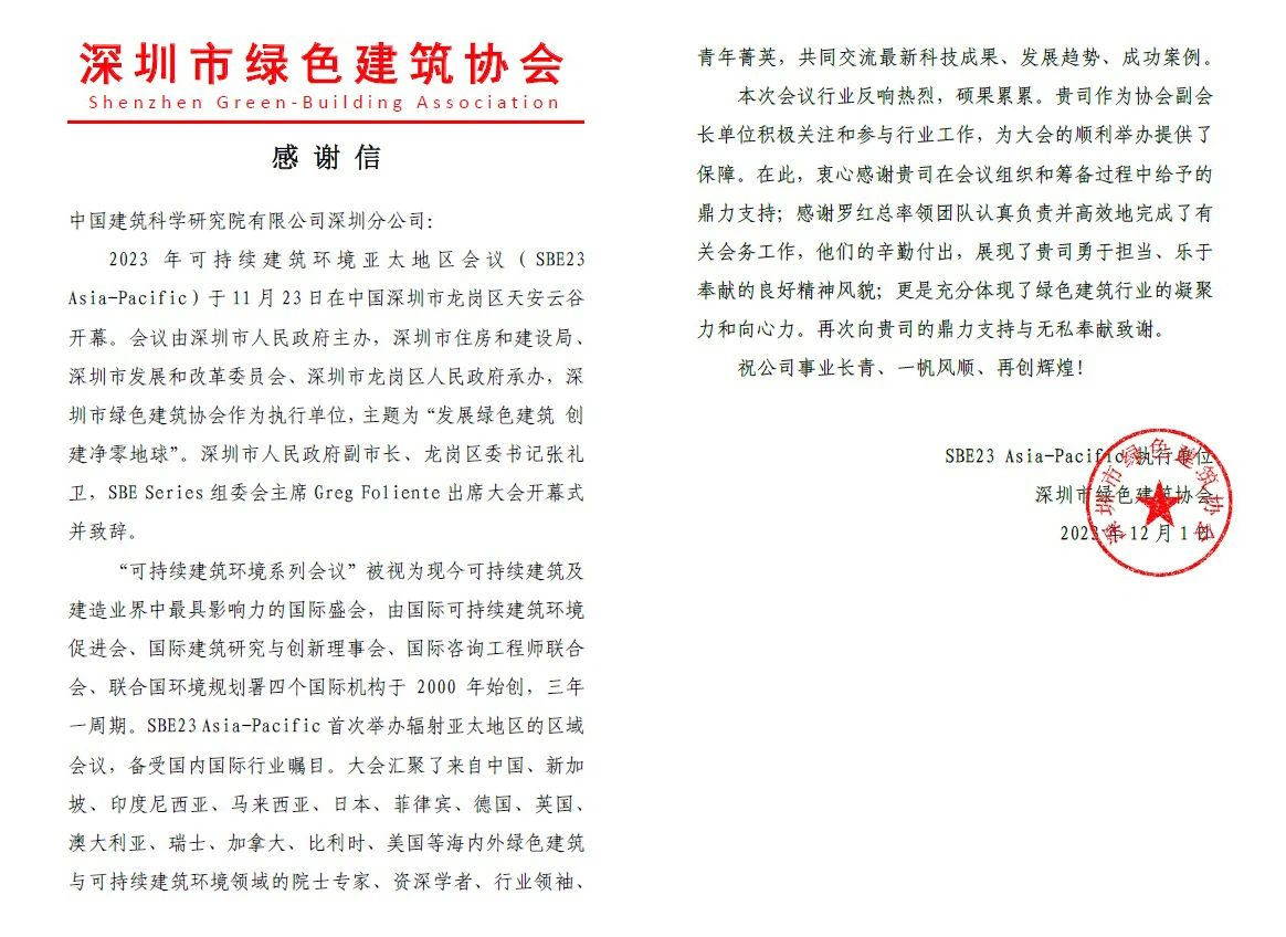 近期,深圳市綠色建筑協(xié)會(huì)向中國(guó)建研院深圳分公司發(fā)來感謝信,對(duì)中國(guó)建研院深圳分公司支持保障2023年可持續(xù)建筑環(huán)境亞太地區(qū)會(huì)議順利舉辦表示感謝。