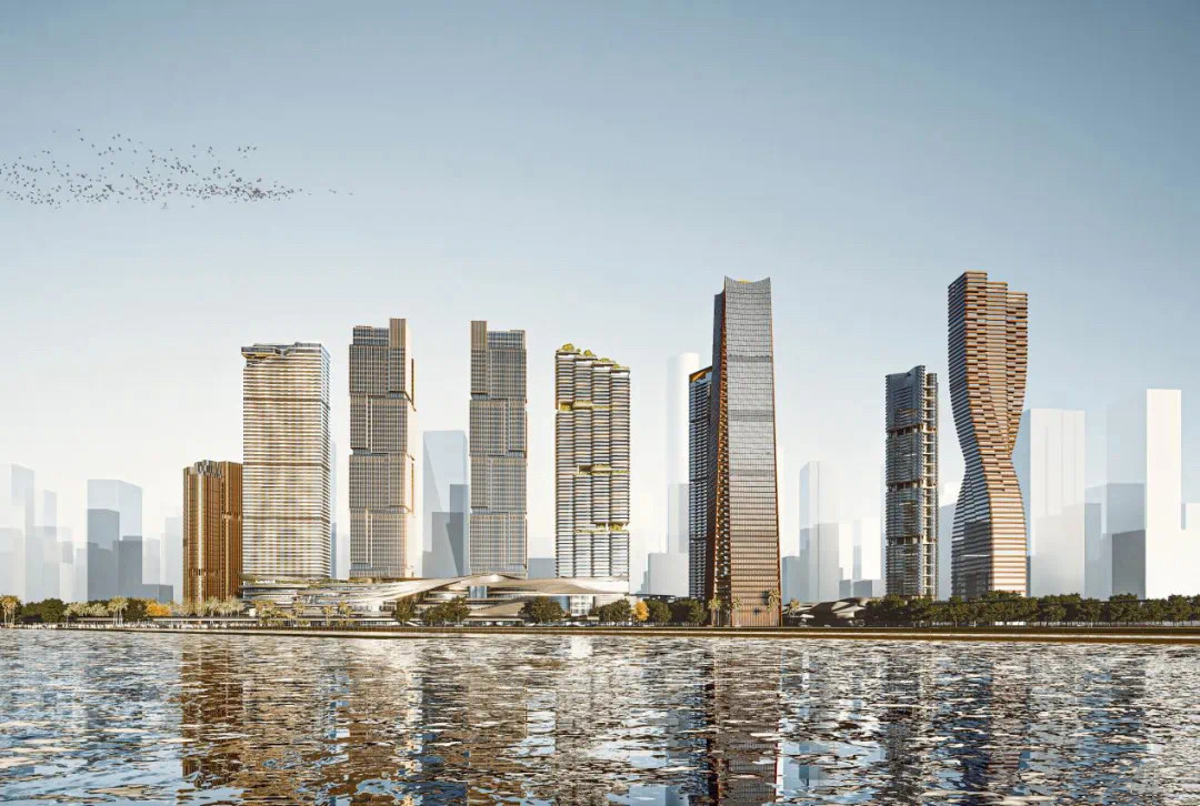 前海國(guó)際樞紐中心項(xiàng)目位于前海CBD桂灣片區(qū)的核心位置,作為深圳在建規(guī)模超大的樞紐TOD工程之一,用地面積達(dá)20公頃,未來(lái)將打造成集綜合交通樞紐、立體商業(yè)、甲級(jí)辦公、國(guó)際星級(jí)酒店、商務(wù)公寓于一體的超級(jí)樞紐城市綜合體。樞紐項(xiàng)目上蓋有9棟超高層建筑,其中T2為商務(wù)公寓,建筑高度約250米。T3和T4為雙子塔超甲級(jí)寫字樓,建筑高度近300米,其變化豐富的立面打造出獨(dú)特的綜合體建筑形象,因緊鄰前海灣,T3、T4寫字樓造型上還具有“水石相間”的含義,兩棟對(duì)稱的塔樓將成為該項(xiàng)目的亮點(diǎn)封面之一。
