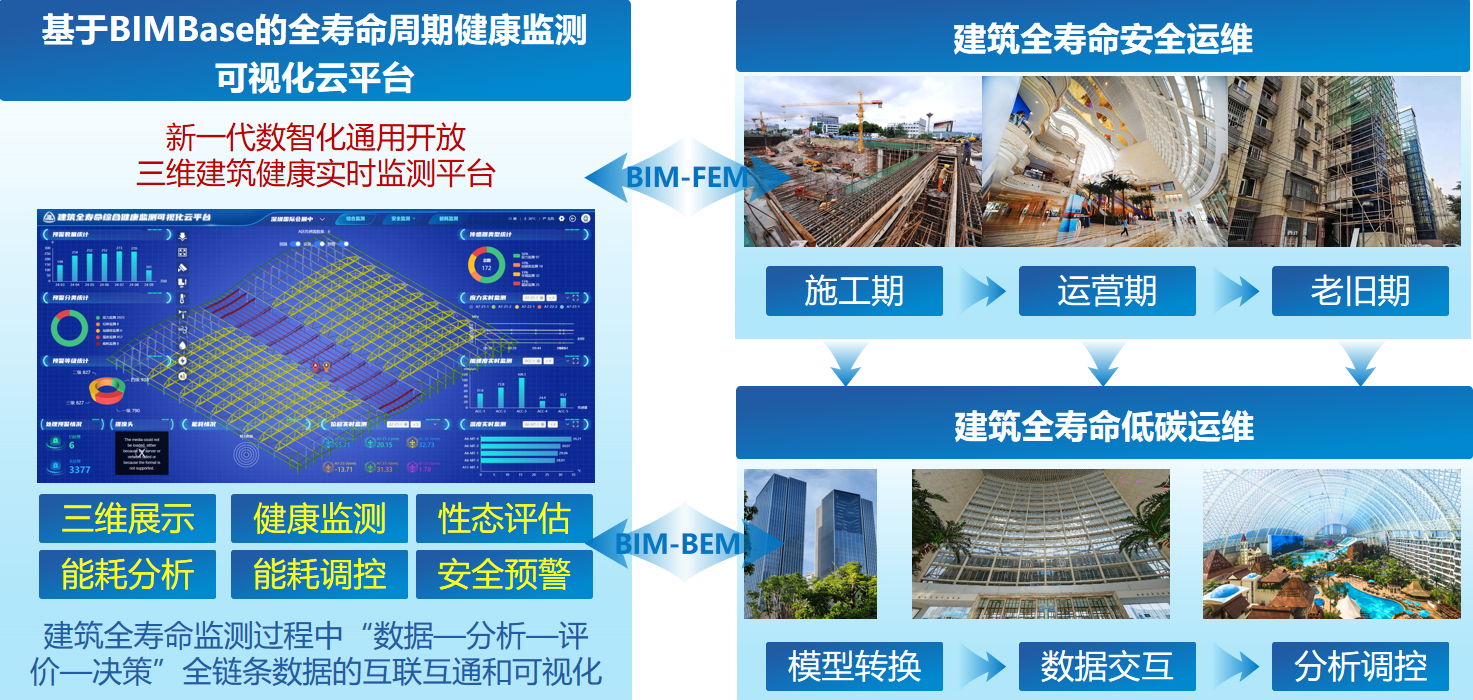 ??“建筑安全與能耗數(shù)字化集成監(jiān)測關(guān)鍵技術(shù)”科技成果針對現(xiàn)階段建筑安全及能耗整體綜合性能狀態(tài)的分析、理解、預(yù)警難度大,結(jié)構(gòu)安全與建筑能耗運維效率低下,海量建筑數(shù)字信息安全可控能力差的突出問題,面向我國“數(shù)字住建”建設(shè)發(fā)展目標(biāo),積極響應(yīng)數(shù)字化轉(zhuǎn)型背景下建筑全壽命周期內(nèi)健康與綠色運維的重大需求,搭建了基于國產(chǎn)自主知識產(chǎn)權(quán)BIMBase的建筑全壽命周期健康監(jiān)測可視化云平臺,提出了建筑圍護結(jié)構(gòu)與主體結(jié)構(gòu)關(guān)聯(lián)性分析與一體化監(jiān)測技術(shù),開發(fā)了建筑在實際運行邊界條件下的最優(yōu)能效仿真平臺,研制了基于BIMBase平臺的建筑信息模型到建筑能耗模型的高效轉(zhuǎn)換工具,形成了建筑安全與能耗數(shù)字化集成監(jiān)測成套關(guān)鍵技術(shù)體系,增強了專業(yè)領(lǐng)域核心競爭力。