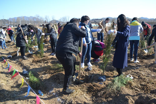 上午九點半,院團委組織54名青年分乘兩輛車來到懷柔植樹基地,兩人一組,男女搭配,分工合作,男青年負責挖坑、擔水,女青年負責扶苗、培土,大家干的熱火朝天,每人都親手種植了一棵小樹,并在自己種植的小樹上,小心翼翼的掛上自己的標牌,認真地寫上自己的寄語。